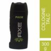 Live it up and make this world your own. Be the man who stops at nothing while setting benchmarks for others. Engineered for the man who leads from the front, Axe Pulse Talcum Powder will make you irresistible. Let your fragrance set the tone for the perfect day to start. A fragrance crafted to ensure youre always the centre of attention, wherever you go. This fragrance complements your moves with a refreshing and luxurious aura. Axe Pulse Talc is specially designed to give you a fragrance that would make you invincible and also give you deodorant-like protection that you need against sweating. It also controls body odour, when you tend to sweat the most. The masculine and citrus scent keeps you refreshed and revived throughout the day. It absorbs the excessive oil secreted on the skin and gives a fresh sweat free feeling. Be sharp. Be bold. Be the man every woman desires. We pride ourselves as the creators of irresistible fragrances. Axe fragrances not only smell good but also keep you fresh, clean and confident. Axe range of talcum powders, after shave lotions and deodorants provide longer lasting protection that goes on from work, to party, to after party, to after the after party. Features & Benefits- Masculine and citrus scent  Keeps your skin fresh and clean Safe on skin   Stimulates your senses Amplifies a smooth shave Day long effect