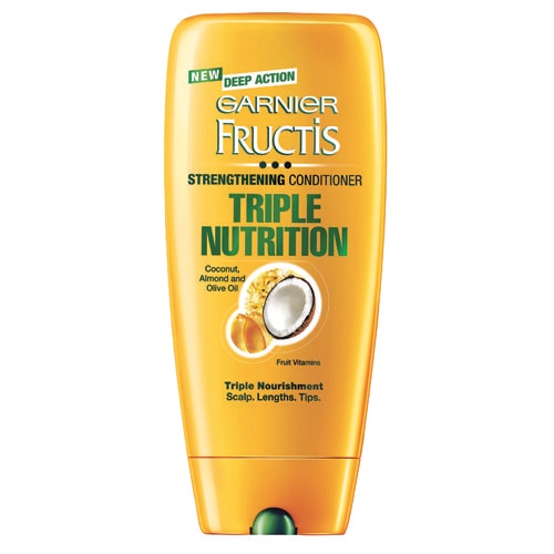 Triple Nutrition, Triple Strength from scalp to lengths to tips. Now your scalp feels nourished and hair is strengthened with every use. A new conditioning formula with an exquisite fragrance which extremely easily detangles your hair. Formula with a combination of oils and fruit vitamins nourishes and strengthens hair from scalp through lengths to tips. The first conditioner from Garnier Fructis that can be applied on scalp. Result – Hair is soft & extremely easy to detangle. • A nourishing and strengthening conditioner with the benefits of oils and fruit vitamins acts on scalp, through lengths and tips leaving hair strong, nourished, shiny and manageable. • Enriched with the goodness of Olive, Almond, Coconut Oils and fruit vitamins. • Conditioner has been specially developed for Indian women and has an exquisite fragrance.