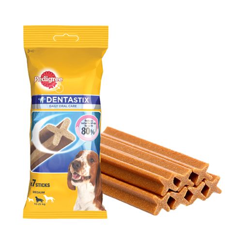 • Dentastix is daily oral care treat for your pet • It has a unique X shape that creates sheer forces on the dogs teeth to dislodge food particles. • It has Active ingredients zinc sulphate & sodium trio polyphosphate that help in slowing down the rate of tartar build up. • Combination of its special texture and active ingredients is scientifically proven to help reduce tartar build-up by up to 80 %