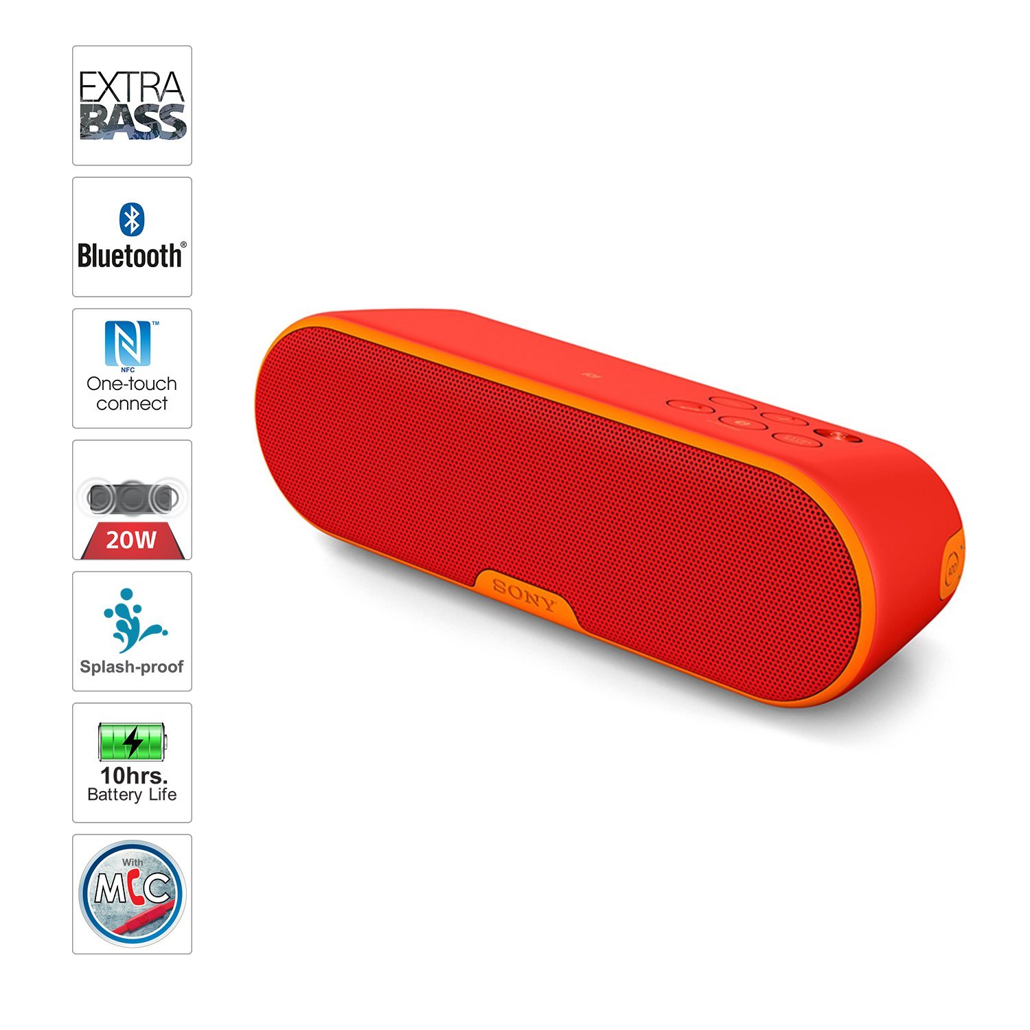 Additional Features EXTRA BASS mode for deep, punchy sound, One-touch listening with NFC and Bluetooth®, Up to 10 hours of battery life, Water resistant for worry-free use, Compact, portable design, Dual 1.65″ Full-Range Drivers, Tuned for Dance Music