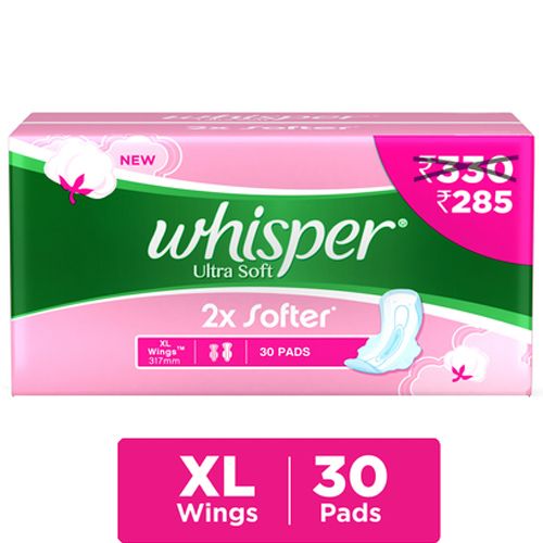 Feel comfortable with Whisper Ultra Soft sanitary pads with wings. . For extra gentleness on your skin, Whisper Ultra Soft pads are two times softer vs. Whisper Choice Ultra and contain a soft top sheet in both the centre and wings. With Whisper Ultra Soft pads, your skin will get all the care it needs and you will get all the confidence you deserve. These pads are nearly 40% longer vs. Whisper Choice Wings and have soft pores that drive liquid to the core and lock it away, so you have extra coverage and long-lasting protection. The stretchable wings in Whisper Ultra Soft pads wrap around your panties to keep the pad in place, while the fresh odourless pearls capture and lock away period odour.